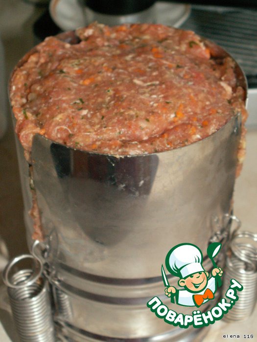 Заполняем ветчинницу до краeв фаршем, накрываем крышкой и зажимаем пружинами. -