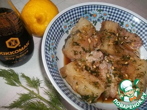 Филе рыбы промыть и обсушить, уложить в миску. У меня филе судака, разрезанное на 4 кусочка. В другой посуде смешать мелко порубленный укроп и чеснок, натертую цедру половинки небольшого лимона и соевый соус (рекомендую ТМ "Kikkoman"). Залить маринадом рыбу и оставить на 20-30 минут.