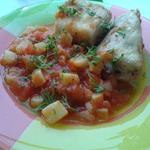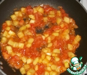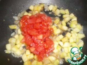 В это время приготовим томатную салсу. Помидор ошпарить кипятком и снять шкурку. С молодого кабачка срезать кожицу. Нарезать помидор, кабачок и лук маленькими кубиками. В сковороде разогреть масло, жарить кабачок и лук на среднем огне, помешивая, около 5 минут. Добавить помидор и увеличить немного огонь.