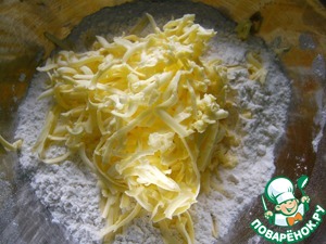Добавить натёртое на крупной тёрке охлаждённое масло и перетереть его с мукой до состояния крошки