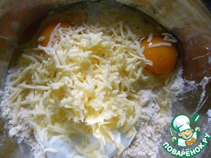 В полученную смесь добавить яйца, сметану, сыр, натёртый на крупной тёрке