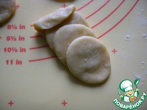 Выложить на рабочую поверхность, подпыленную мукой, и раскатать в пласт толщиной 2-3 мм. Вырезать кружочки при помощи стопки (у меня диаметром 4,5 см), которую предварительно окунуть в муку
