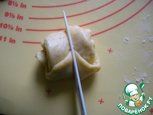 Лишнее тесто убрать, скатать в шар. Из полученных кружочков сложить внахлёст по 4 шт