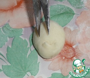 Защипываем края. Кладем изделие вниз швом. Острыми ножницами делаем два надреза в виде ушек для зайчиков.