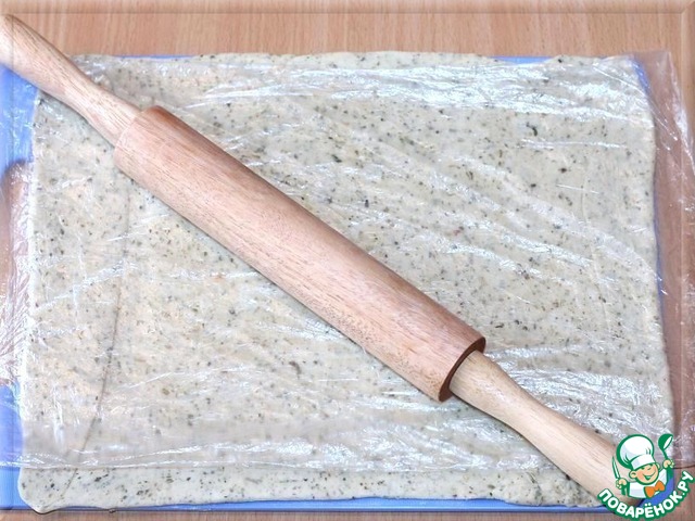 Подошедшее тесто обомните, переложите на стол, закройте целлофаном и раскатайте прямоугольник размером 42 * 30 см.