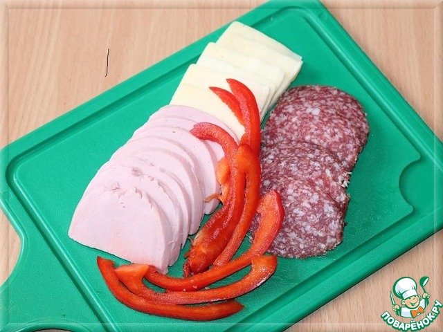 Порежьте тонко ветчину (или колбасу), сыр и салями, сладкий перец соломкой, а оливки с маслинами разрежьте пополам.