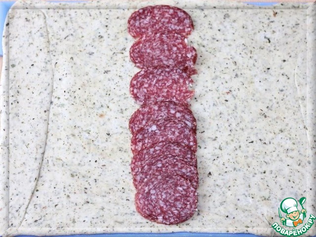 Я готовила из половины ингредиентов у меня один ряд в центре пирога. Поэтому вы или готовите 2 пирога как у меня или один большой пирог и тогда укладываете в середине два ряда порезанных продуктов.