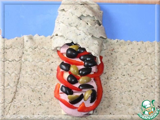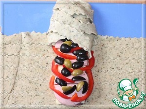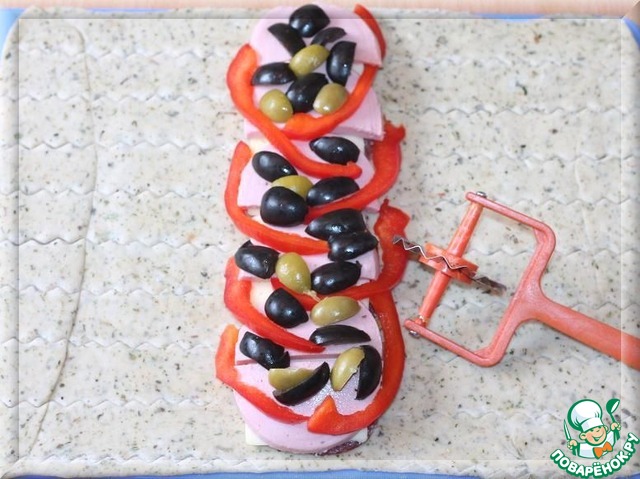 и ветчину (или колбасу), сверху положите сладкий перец и маслины с оливками. Открытые края теста разрежьте поперек на полости шириной 3 см.