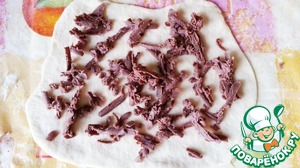 Тесто раскатать в пласт, засыпать шоколадным маслом, свернуть в рулет