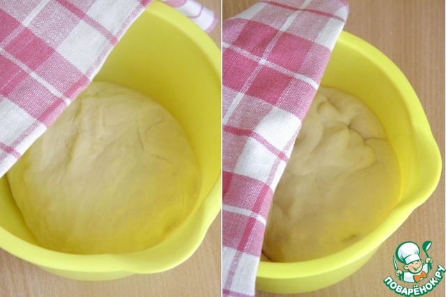 • Тесто накрыть и оставить для подъема в теплом месте на 90мин. За это время нужно будет обмять тесто один раз.