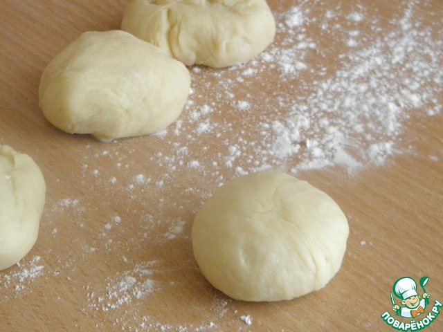 • Рабочую поверхность подпылить мукой, выложить тесто и разделить его на 10 кусочков. Из каждого скатать круглую заготовку.