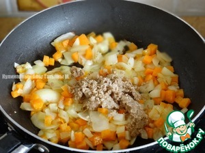 Лук и морковь нарезать произвольно, обжарить на масле, добавить орех;