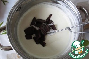 Снимаем кастрюльку с творожной массой с водяной бани, всыпаем сахар и выкладываем кусочки шоколада.