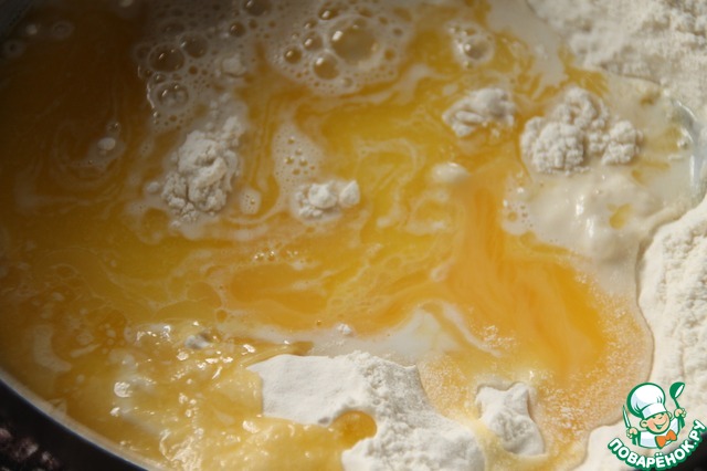 Масло растопить, смешать с молоком. Теплую масляно-молочную смесь влить в муку. Добавить яйцо.