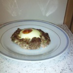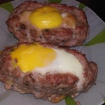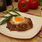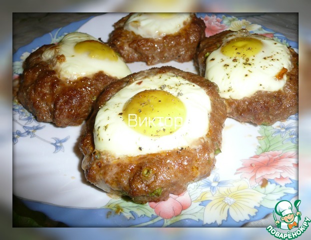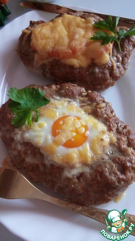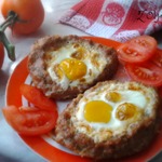Кружкой делаем углубление в котлете. Переносим ее сразу в форму для выпечки, смазанную растительным маслом. Руками помогаем делать отверстие-лодочку. Вбиваем в отверстие сырое яйцо, и отправляем котлеты в духовку при 190 град. на 25-30 минут.