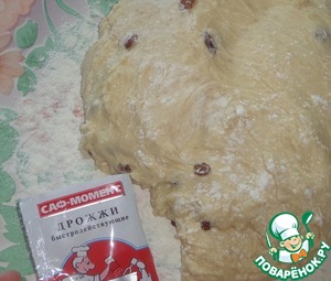 Затем начинаем замешивать тесто. Добавляем яйца, растопленный маргарин и масло сливочное. Добавляем остальной сахар. Добавляем муку (сколько возьмет тесто, оно должно быть мягким и липнущим к рукам), изюм, эссенцию и растительное масло. Замешиваем тесто и ставим в теплое место подходить на 2-4 часа.