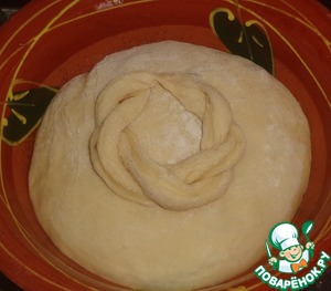 Понадобится глиняное блюдо. В него кладем тесто и делаем узор из теста для кулича. Духовку разогреваем до 200-220 градусов. На 15-20 минут тесто оставляем на кухонном столе в блюде. Затем смазываем кулич яичным желтком и отправляем в духовку. Выпекаем до румяного цвета.
