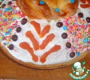 Курагу порезать на полосочки и укладываем как показано на фото. Узор также украшаем пасхальной посыпкой.
