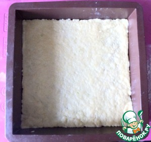 Достать охлажденное тесто. Каждый шарик помять в руках, чтобы нагреть тесто. Раскатать 4 пласта, толщиной около 3-4 мм. Обрезать по размеру формы. У меня 23*23 см.