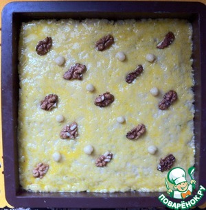 Выложить на первый пласт половину ореховой начинки.
