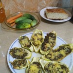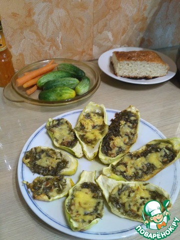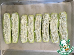 Кабачки выкладываем на противень застеленный пергаментной бумагой выкладываем на каждый кабачок начинку