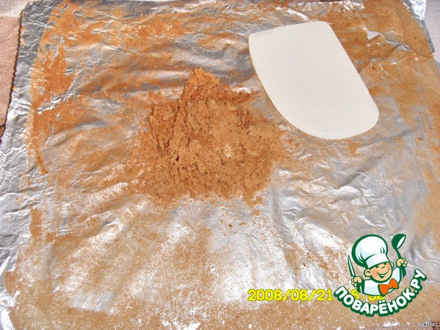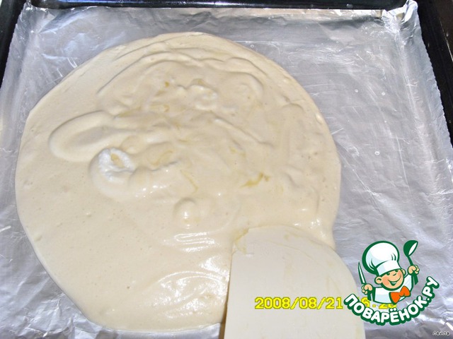 Сделали тесто, выстилаем бумагу или кальку, смазать маслом, распределить по всей форме. Выпекаем в духовке, у кого как, я минут 15