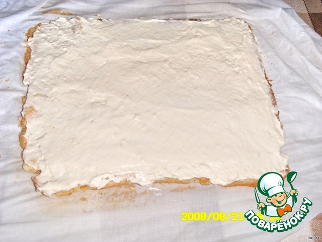 Начинаем собирать рулет: осторожно развернуть, намазать кремом, снова завернуть рулетом.