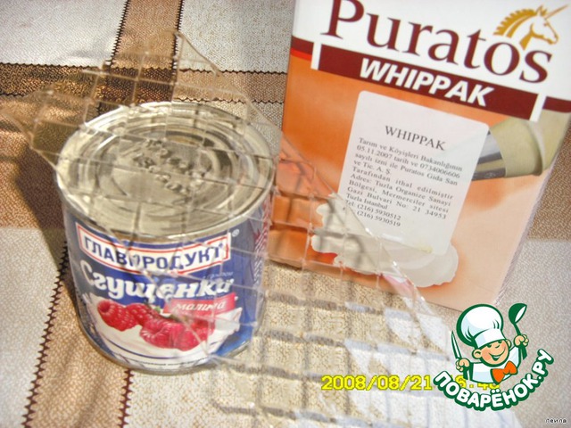 Взбить сливки, после постепенно влить сгущенку (сейчас новые вышли с добавкой малиной) и замоченный желатин. Кладем в холодильник. -