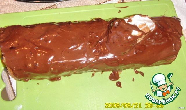 Обмазать шоколадной глазурью, чтобы получилось вид поленом. Срезать с углов рулета (можно положить сразу два бруска) я положила из одного конца на край, узоры на рулете делаем ВИЛКОЙ.
