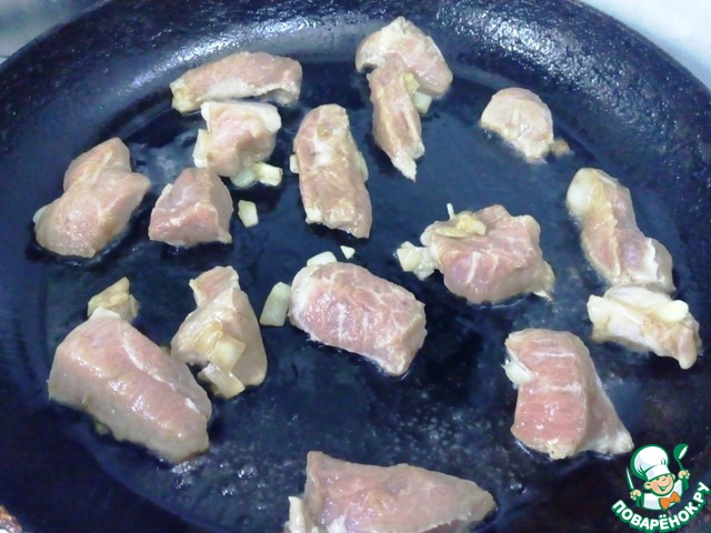 Мясо без лука обжарить небольшими порциями на сковороде, по паре минут. Лук нам не понадобится.