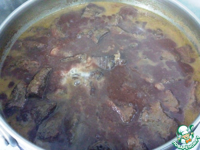 Залить мясо уже вишневым вином :), после блендера оно получилось с пеной, ее убирать не надо, она постепенно осядет сама. Накрыть крышкой и тушить на медленном огне до мягкости, у меня вышло чуть больше часа.