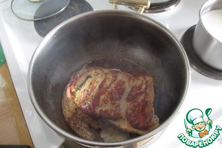 Итак, вынимаем мясо из маринада и обсушиваем бумажным полотенцем. Вливаем в глубокую сковороду или кастрюлю оливковое, или другое растительное масло, хорошо его разогреваем, добавляем ягоды можжевельника и обжариваем на сильном огне наш кусок свинины со всех сторон до румяной корочки.