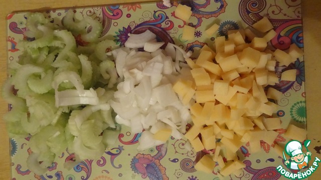 Теперь режем черешковый сельдерей ( если его нет, то надо добавить зеленый огурец) сыр, и лук. ( лук можно предварительно ошпарить кипятком, у меня был молодой лук и я его просто мелко порезала)