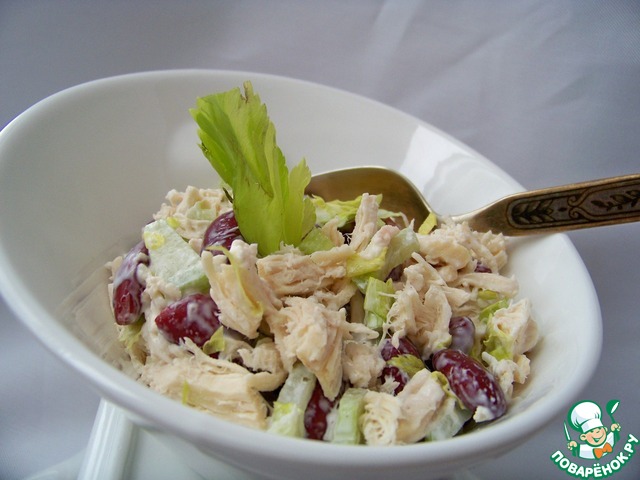 Самое долгое в этом салате-это отварить курицу... А так все просто: мелко режем куриное мясо, сельдерей корневой, готовую баночную фасоль промываем холодной водой