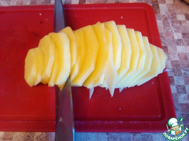 Картошку нарежем тонким пластиночками. Постарайтесь порезать картофель тонко - иначе он не пропечётся