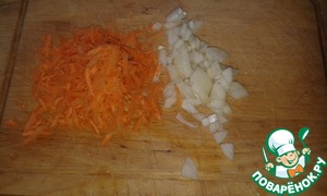 Лук мелко порезать, морковь натереть на крупной терке. Слегка обжарить на растительном масле