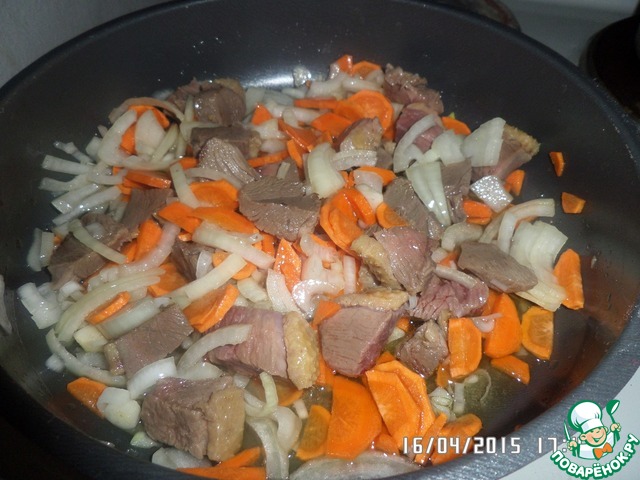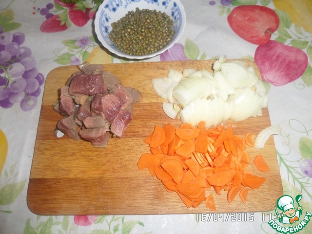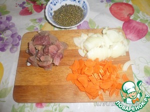 Нарезаем мясо - кубиками, лук - четвертинками, морковь - полукольцами.