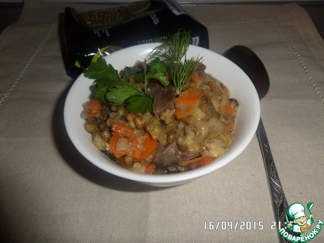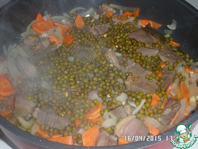 Добавляем к обжаренным овощам и мясу промытый маш. Хорошо перемешиваем. Добавляем 2-2,5 стакана воды. Даем закипеть. Убавляем огонь и тушим 1-1,5 часа. Солим за 10 минут до окончания приготовления.