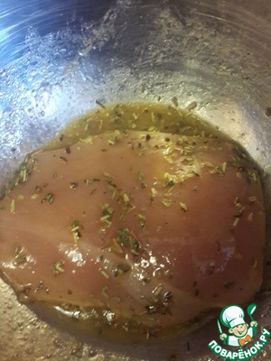 На раскаленную сковороду с 1 ст. л. масла кладем грудку и обжариваем с 2-х сторон быстро. Затем вливаем в сковороду оставшийся маринад, накрываем крышкой, и на самом маленьком огне оставляем на 10 минут