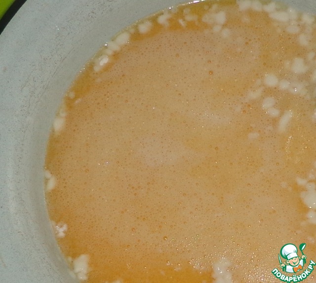 • Затем добавляем яйцо и растопленное сливочное масло. Всыпаем муку и замешиваем тесто. Оставляем тесто в теплом месте на 2 часа.