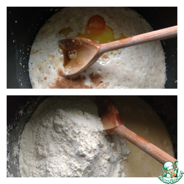 • Добавить растопленое масло, специи, яйцо и белок от второго яйца. Тщательно перемешать и всыпать оставшуюся муку. Замесить тесто. Добавить растительное масло, еще немного вымесить тесто, и оставить его на 1,5 часа в теплом месте.