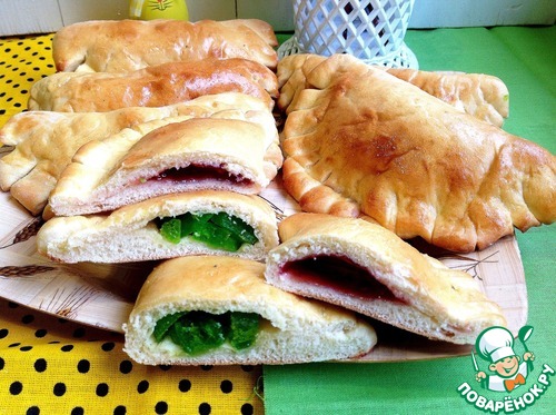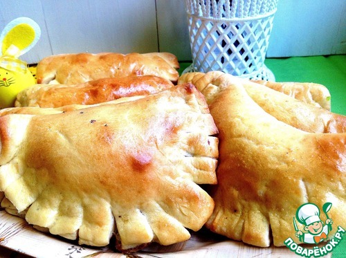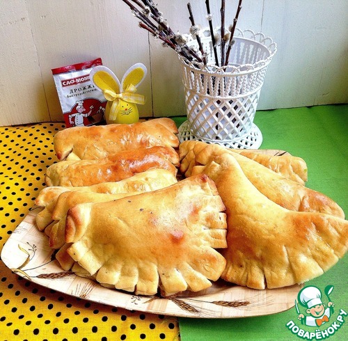 • Защипнуть булочки как чебуреки. Сделать надрезы по краю, как на фото. Взбить оставшийся желток, смазать булочки. Отправить в духовку при 190 гр до зарумянивания. Я использую силиконовой коврик для выпечки, поэтому ничем его не смазываю.