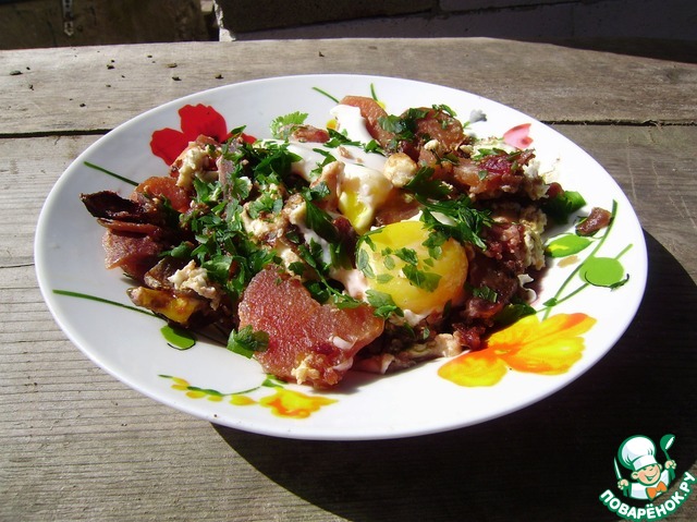 • Сверху аккуратно разбить 3 яйца, не нарушая целостности желтков, поперчить, закрыть сковороду крышкой и жарить на слабом огне в течение нескольких минут до полной готовности яиц. Украсить по желанию свежей зеленью, подавать сразу же.