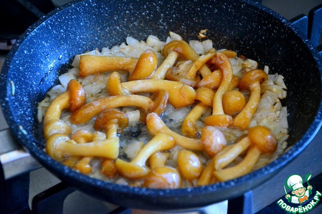 Для начинки лук нарезать кубиком и обжарить на растительном масле до румяного цвета, затем добавить опята (у меня замороженные).