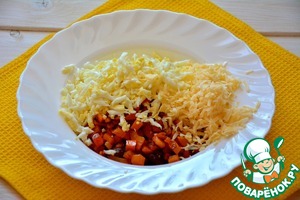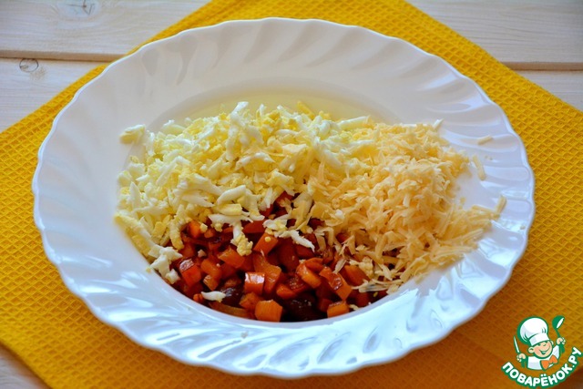В чашке смешать грибную массу, обжаренный перец, натертое на терке яйцо и сыр