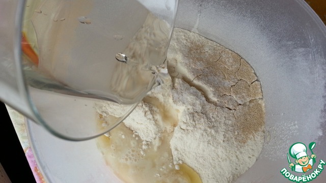 Выливаем тёплую воду и замесить мягкое, не прилипающее к рукам тесто.
