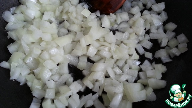 В это это время займёмся начинкой. Лук режем кубиками и жарим на разогретой сковороде.