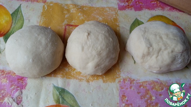 Выложить тесто на посыпанный мукой стол, и делим на три шарика, с размером ладони.