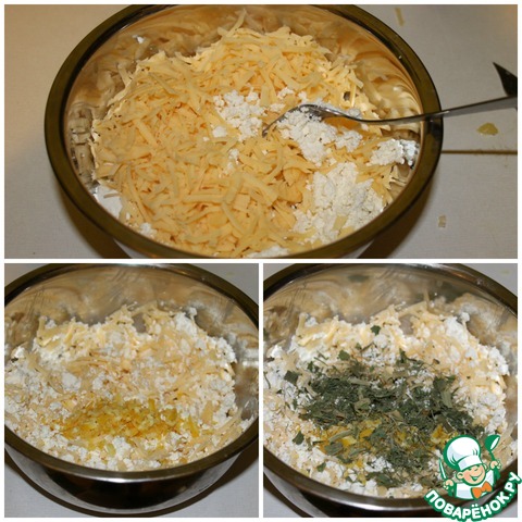 В творог добавляем 2/3 сыра, петрушку, лимонную цедру, соль, перец, все хорошенько перемешиваем.