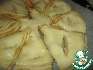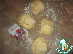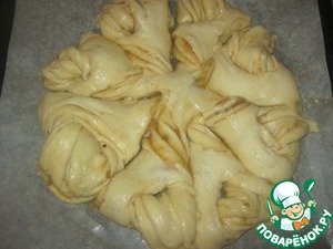 Растворить дрожжи в теплой сыворотке. Маргарин растопить. Замесить тесто из всех ингредиентов и положить его в прохладное место на пару часов-я вынесла на балкон (у нас сейчас холодно)